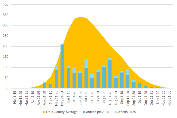 This graph shows the total number of odonata observations for the county in blue, with the average for all Ohio counties in orange. The season is divided into 10 or 11 day segments by Month – basically early-month, mid-month, and late-month.