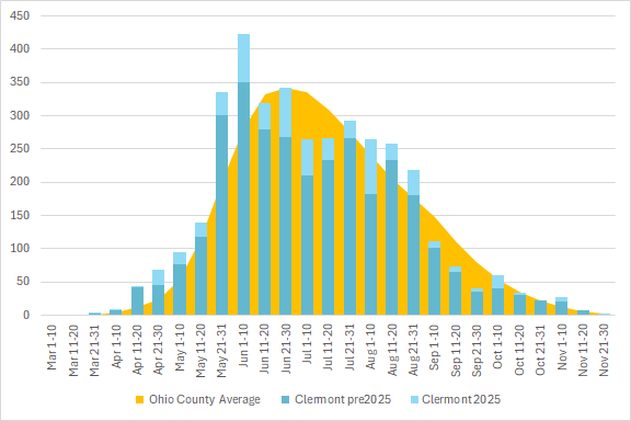 This graph shows the total number of odonata observations for the county in blue, with the average for all Ohio counties in orange. The season is divided into 10 or 11 day segments by Month – basically early-month, mid-month, and late-month.