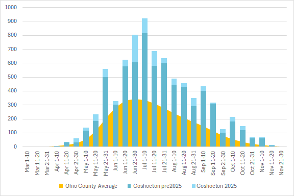 This graph shows the total number of odonata observations for the county in blue, with the average for all Ohio counties in orange. The season is divided into 10 or 11 day segments by Month – basically early-month, mid-month, and late-month.