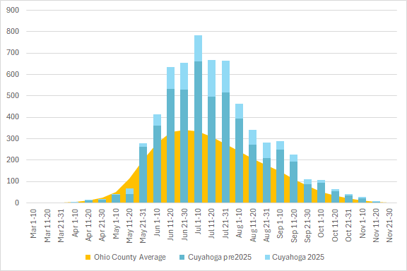 This graph shows the total number of odonata observations for the county in blue, with the average for all Ohio counties in orange. The season is divided into 10 or 11 day segments by Month – basically early-month, mid-month, and late-month.