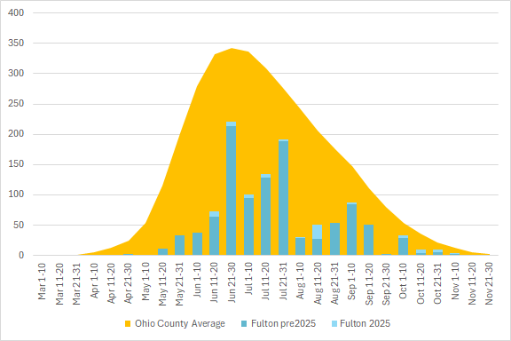 This graph shows the total number of odonata observations for the county in blue, with the average for all Ohio counties in orange. The season is divided into 10 or 11 day segments by Month – basically early-month, mid-month, and late-month.
