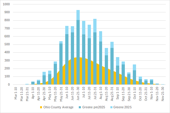 This graph shows the total number of odonata observations for the county in blue, with the average for all Ohio counties in orange. The season is divided into 10 or 11 day segments by Month – basically early-month, mid-month, and late-month.