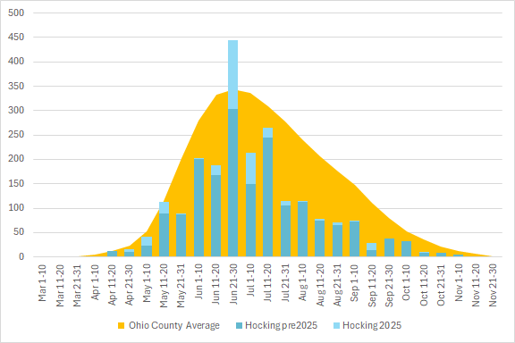 This graph shows the total number of odonata observations for the county in blue, with the average for all Ohio counties in orange. The season is divided into 10 or 11 day segments by Month – basically early-month, mid-month, and late-month.