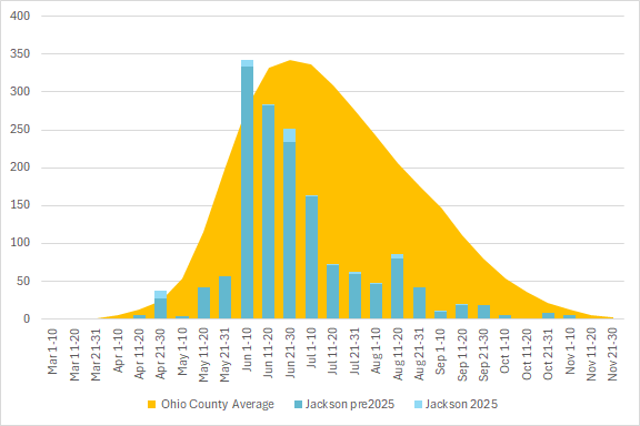 This graph shows the total number of odonata observations for the county in blue, with the average for all Ohio counties in orange. The season is divided into 10 or 11 day segments by Month – basically early-month, mid-month, and late-month.