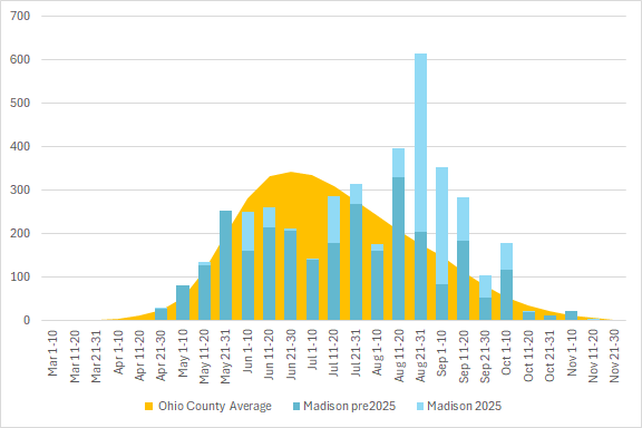 This graph shows the total number of odonata observations for the county in blue, with the average for all Ohio counties in orange. The season is divided into 10 or 11 day segments by Month – basically early-month, mid-month, and late-month.