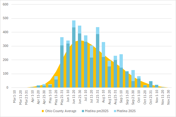 This graph shows the total number of odonata observations for the county in blue, with the average for all Ohio counties in orange. The season is divided into 10 or 11 day segments by Month – basically early-month, mid-month, and late-month.