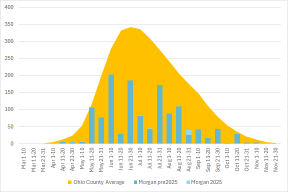 This graph shows the total number of odonata observations for the county in blue, with the average for all Ohio counties in orange. The season is divided into 10 or 11 day segments by Month – basically early-month, mid-month, and late-month.