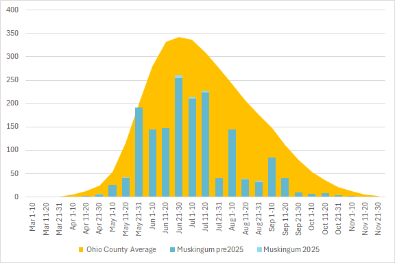 This graph shows the total number of odonata observations for the county in blue, with the average for all Ohio counties in orange. The season is divided into 10 or 11 day segments by Month – basically early-month, mid-month, and late-month.