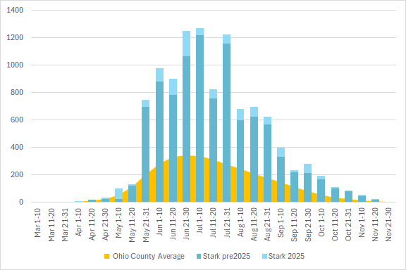 This graph shows the total number of odonata observations for the county in blue, with the average for all Ohio counties in orange. The season is divided into 10 or 11 day segments by Month – basically early-month, mid-month, and late-month.