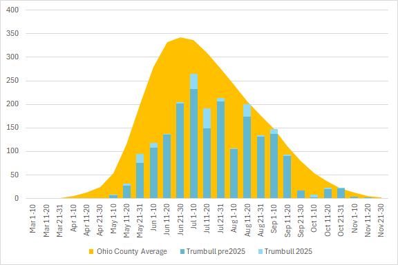 This graph shows the total number of odonata observations for the county in blue, with the average for all Ohio counties in orange. The season is divided into 10 or 11 day segments by Month – basically early-month, mid-month, and late-month.