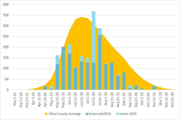 This graph shows the total number of odonata observations for the county in blue, with the average for all Ohio counties in orange. The season is divided into 10 or 11 day segments by Month – basically early-month, mid-month, and late-month.