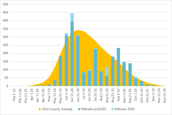 This graph shows the total number of odonata observations for the county in blue, with the average for all Ohio counties in orange. The season is divided into 10 or 11 day segments by Month – basically early-month, mid-month, and late-month.