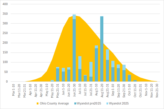 This graph shows the total number of odonata observations for the county in blue, with the average for all Ohio counties in orange. The season is divided into 10 or 11 day segments by Month – basically early-month, mid-month, and late-month.